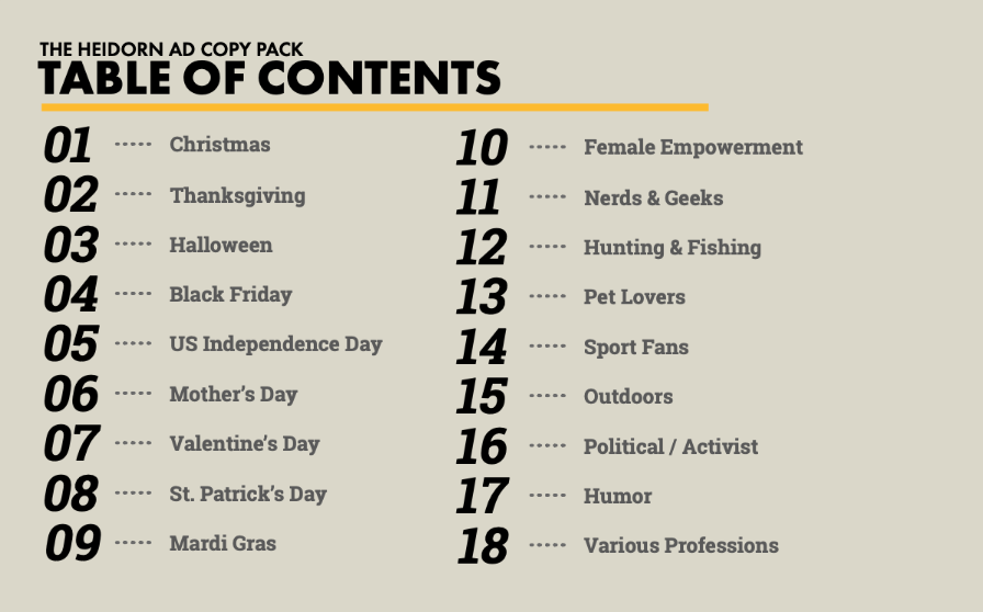 This list of 180+ t-shirt promotion captions is unlike anything you've ever seen and beats everything else you've ever found googling for "tshirt promotion captions". Heidorn's Captions is not just a list of generic ad copy. It's jam-packed with original and quirky sales captions that are tailored towards the print-on-demand industry and 18 different promotional topics and events.