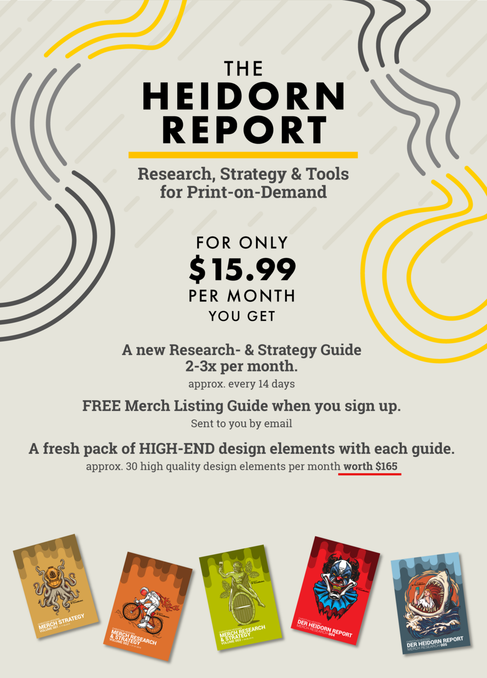 The Heidorn Report is a monthly subscription for all Merch and Print-on-Demand Sellers. Subscribers receive a Research or Strategy Guide approximately 2-3 times per month. Every guide is jam-packed with tons of research data and strategies that will help you with your everyday work. Primary focus is on the US market because it simply offers the best revenue potential. However, I will also increasingly cover the European markets as well every now and then.
